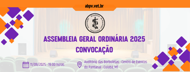 A Diretoria da ABPV na gestão do biênio 2024-2025 convoca os associados para a Assembleia Geral Ordinária que ocorrerá às 19:00h do dia 11 de setembro de 2025 no Auditório das Borboletas - Centro de Eventos do Pantanal, Cuiabá-MT, durante o 8º Congresso de Patologia Veterinária / XXII Encontro Nacional de Patologia Veterinária.