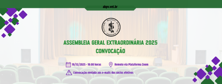 A Associação Brasileira de Patologia Veterinária – ABPV, com sede à Faculdade de Medicina Veterinária e Zootecnia – FMVZ, Universidade Estadual Paulista – Unesp, Campus Botucatu, Distrito de Rubião Jr., devidamente representada por seu Presidente em exercício, FERNANDO HENRIQUE FURLAN GOUVÊA, considerando o que consta no Artigo 27 e §2º do Artigo 28 do Estatuto da ABPV, CONVOCA através do presente ofício, todos os demais associados efetivos para a Assembleia Geral Extraordinária a ser realizada de forma remota:
